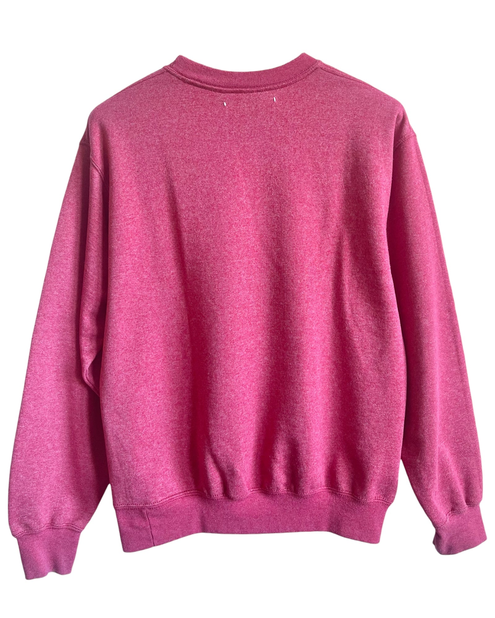 Sweat vintage Fruit of the Loom soigneusement sélectionné pour sa couleur rouge chiné, sa texture douce et sa patine authentique - Pièce unique mixte, upcyclée et peinte à la main avec son pochoir exclusif We Are One Project - "FUCK NORMAL I WANT MAGIC" et "LE COEUR" -
