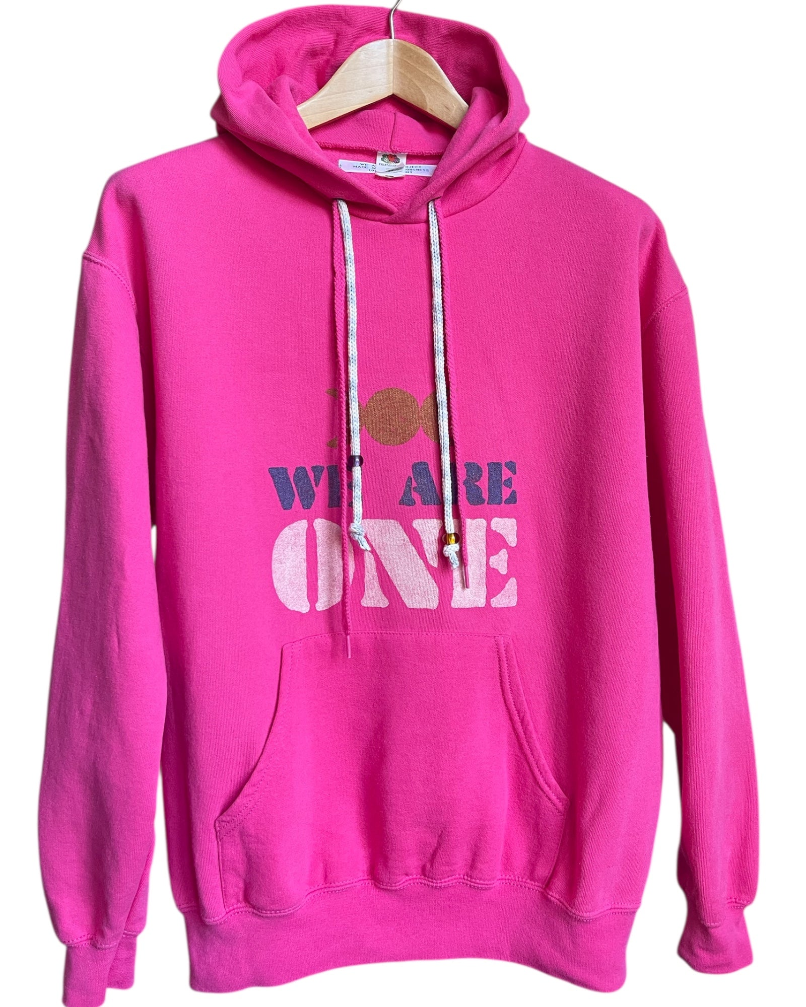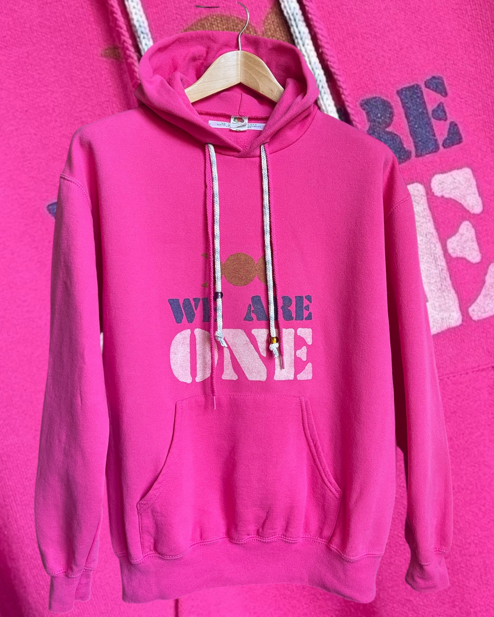 Hoodie vintage Fruit of the Loom soigneusement sélectionné pour sa couleur rose vif, sa texture douce et sa patine authentique - Pièce unique mixte, upcyclée et imprimée à la main avec son pochoir exclusif We Are One Project - WE ARE ONE (couleur violet et craie) - SYMBOLE LUNE (couleur cuivre)-